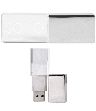 - Take a step in the right direction by adopting the SoHo USB Flash Drive into your next marketing plan! The SoHo has all of the class with a touch of attitude. It features a sleek brushed metal cap that's softened with the crisp, clear glass base. Customization can be done using personalized laser engraving, pad printing or silk-screened imprinting. Whichever method you choose will look brilliant on this drive with a lifetime warranty. Start on the path to a great advertising campaign!