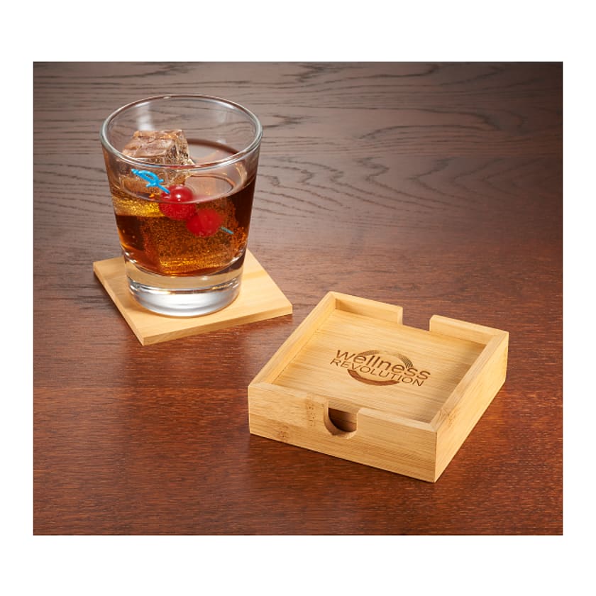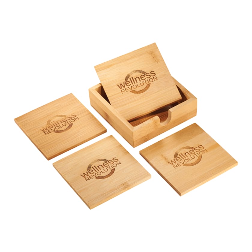 - This tasteful FSC® 100% Bamboo Coaster Set includes four bamboo coasters that each measure 4.50" x 4.50", plus a stylish bamboo caddy to easily store each piece when not in use. The coasters stack neatly in the caddy and put your logo on prominent display. Decoration is available on all four coasters. Due to the nature of the bamboo material, variations in laser imprinting quality may occur.