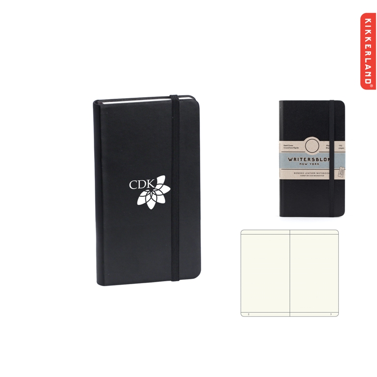 - Hard cover bonded leather pocket notebook. 192 pages of ruled or blank paper and elastic ribbon marker.