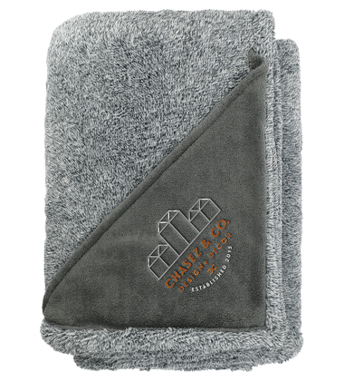- The long threaded, fuzzy and soft hand feel of this 240 gsm polyester fleece blanket is sure to warm your body and your spirit and makes an excellent addition to any home of office space. The multicolored threads give a heathered look to this extra soft and warm 50"x60"x3/8" unfolded blanket and the solid color triangle embroidery patch will allow you to professionally display and show off your company logo. Free embroidery run charges on up to 10,000 stitches. Folded dimensions are 15" x 12.5" x 6".