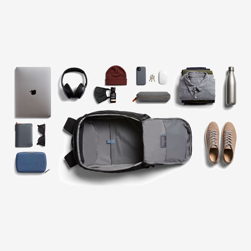 - The Bellroy Transit 20L Workpack is streamlined to cleverly organize work, life and gym gear in a minimalist design. This backpack features a separate laptop section with internal pouch for accessories and can hold devices up to 16". Find what you need easily with the full-zip clamshell opening for easy accessibility and quick-access front pocket with mesh slip pockets and pen loop. Keep your sunglasses safely in the soft-lined pouch on top. The external side pockets invisibly stores a wallet, water bottle and other essentials. A large internal stretch pocket is perfect for holding your gym shoes or sweatshirt, while the internal zip mesh pocket is ideal for storing small items. The contoured, breathable back panel and padded shoulder straps allow for comfortable carrying.