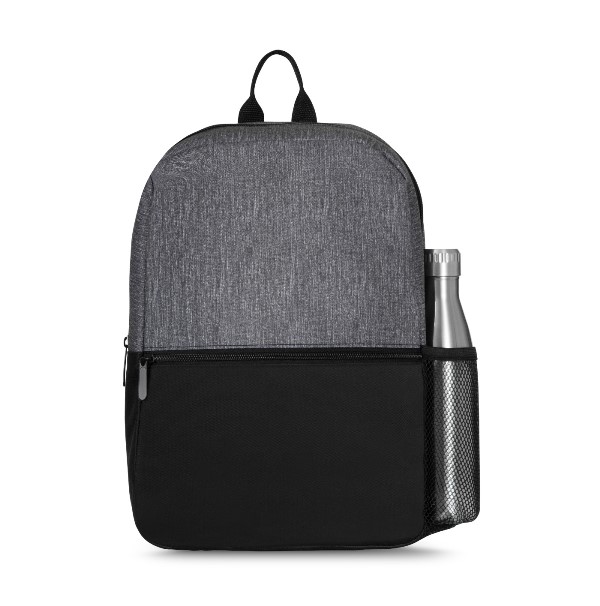 - Simple, yet stylish for everyday use. Zippered opening to main compartment. Side mesh water bottle pocket. Front zippered pocket. Padded, adjustable shoulder straps. Top grab handle.