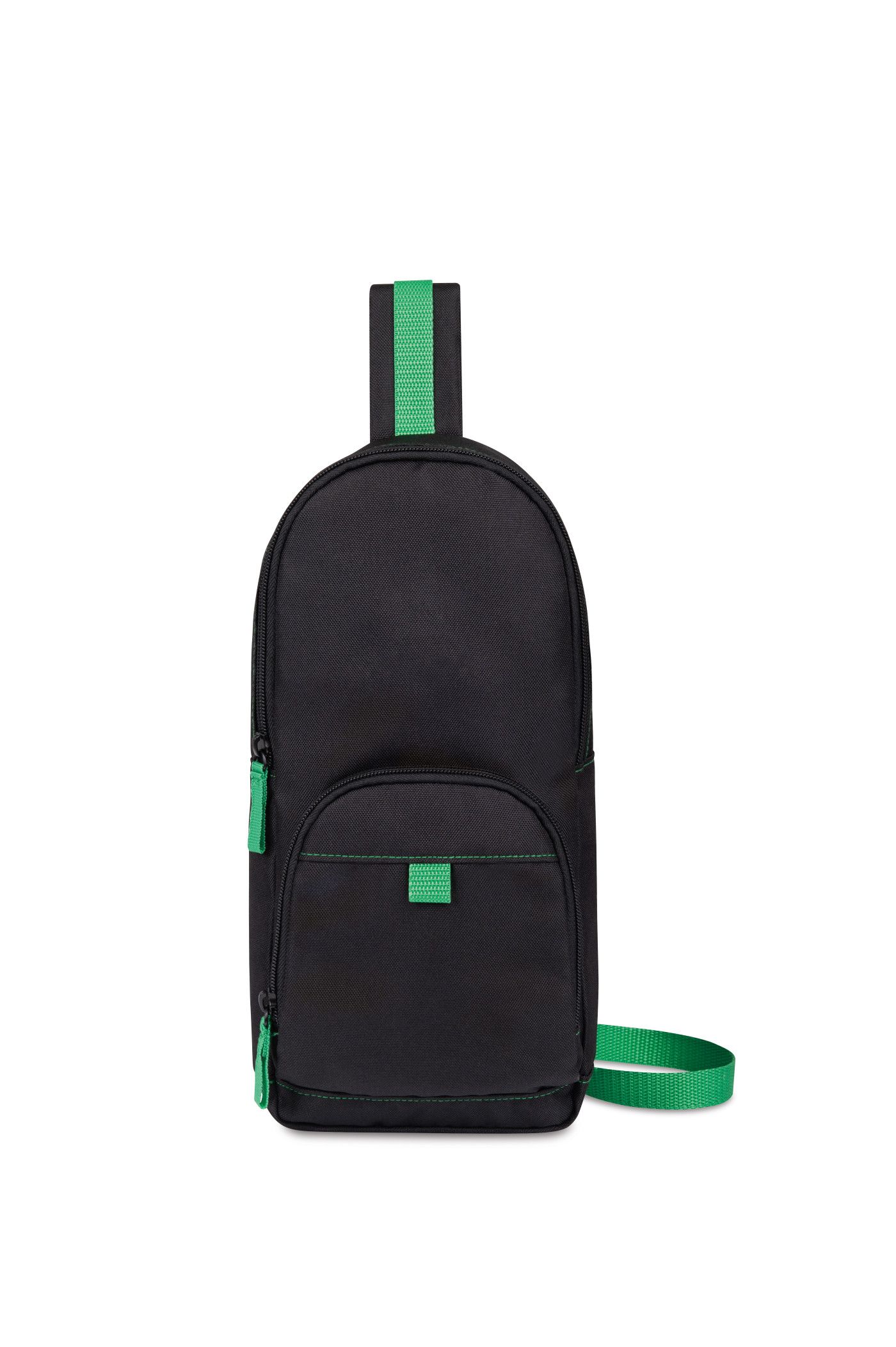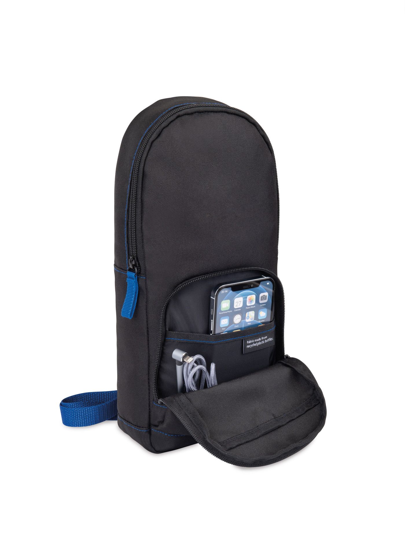 - A modern and sustainable update to a classic sling bag using recycled fabric and webbing made from plastic bottles.