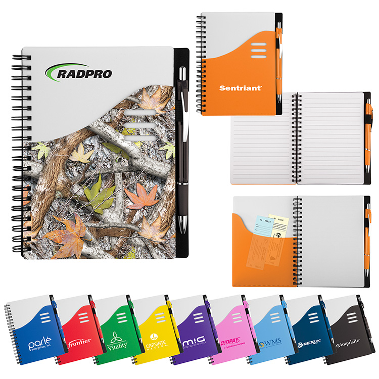 - Spiral bound 70 sheet lined notebook; white cover with large contrast color front pocket with die-cut detail; one pocket on inside front cover; matching color ballpoint pen included.