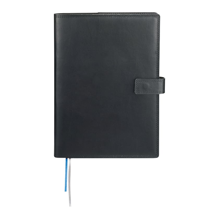 - Record your notes in style with the 7" x 10" Uptown Refillable Leather JournalBook, which features a genuine premier leather cover with a double-stitched border. This sophisticated leather-cover journal contains a 128-page white lined paper refill and has blue and silver ribbon page markers to hold your place. It also includes a business card slot, an elastic pen loop, and a magnetic tab closure for added convenience.