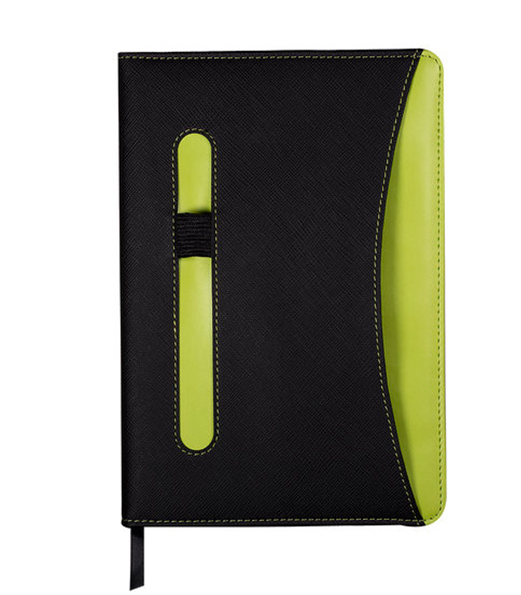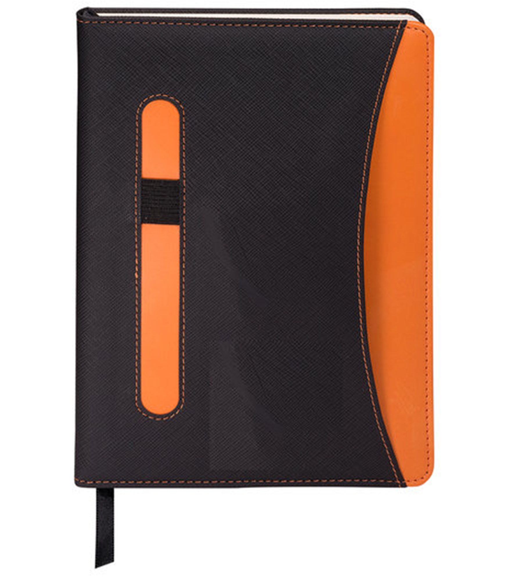 • Journal with textured Faux Leather black PU cover with color accent front pocket and matching elastic pen loop (pen not included)
