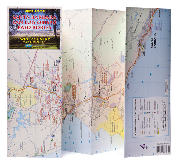 Wineries and vineyards throughout the area from Santa Barbara, San Luis Obispo to Paso Robles, with winery address/phone, hours are shown in this 2015 laminated, gate-folded map of the wineries and vineyards in that area.