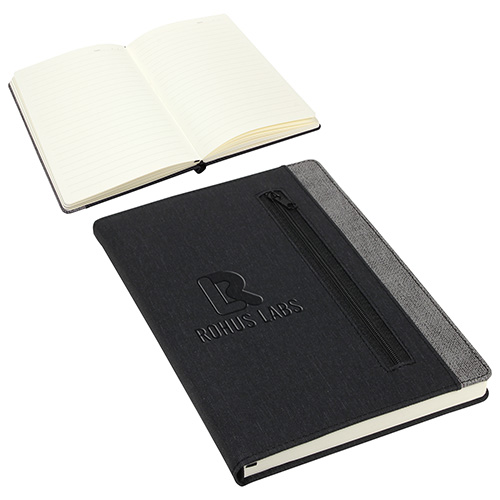 - Two-toned textured hardcover with front zippered pocket