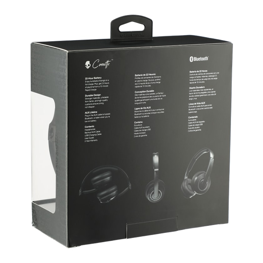 - These Skullcandy Cassette Bluetooth Headphones utilize fast-charge technology to deliver 2.5 hours of playback time after charging for only 10 minutes, perfect to fit your busy on-the-go lifestyle. When fully charged, they supply more than 22 hours of playback time. These collapsible cushioned headphones come with one Micro USB charging cable plus one 3.5mm aux cable and feature built-in controls to change the volume, skip tracks, or answer phone calls.