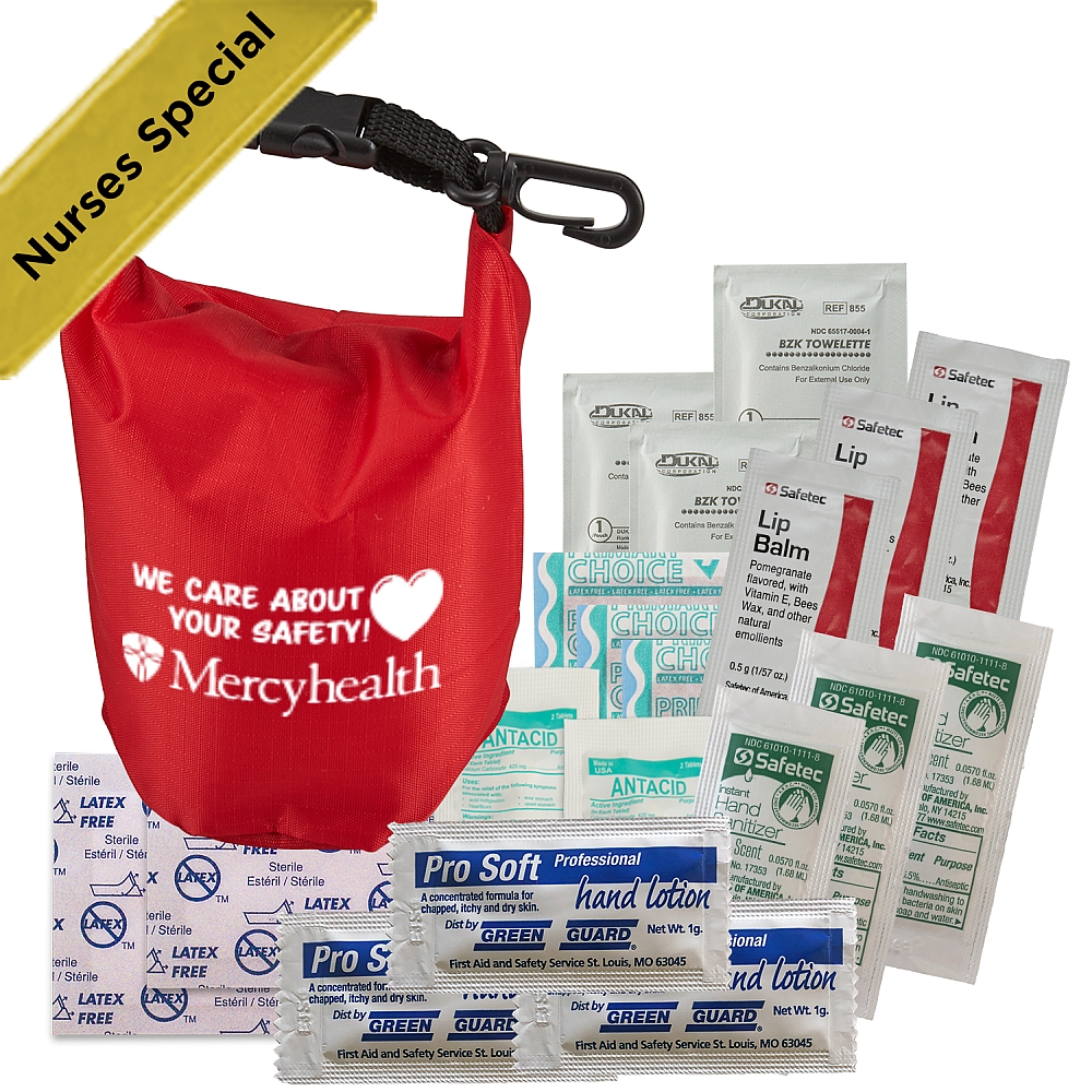 • Includes 3 latex-free bandages, 2 knuckle bandages, 3 antiseptic towelettes, 3 lip balm packets, 3 hand sanitizer packets (66.5% Ethyl Alcohol), 3 hand lotion packets and 2 antacid packets