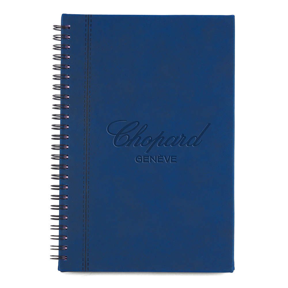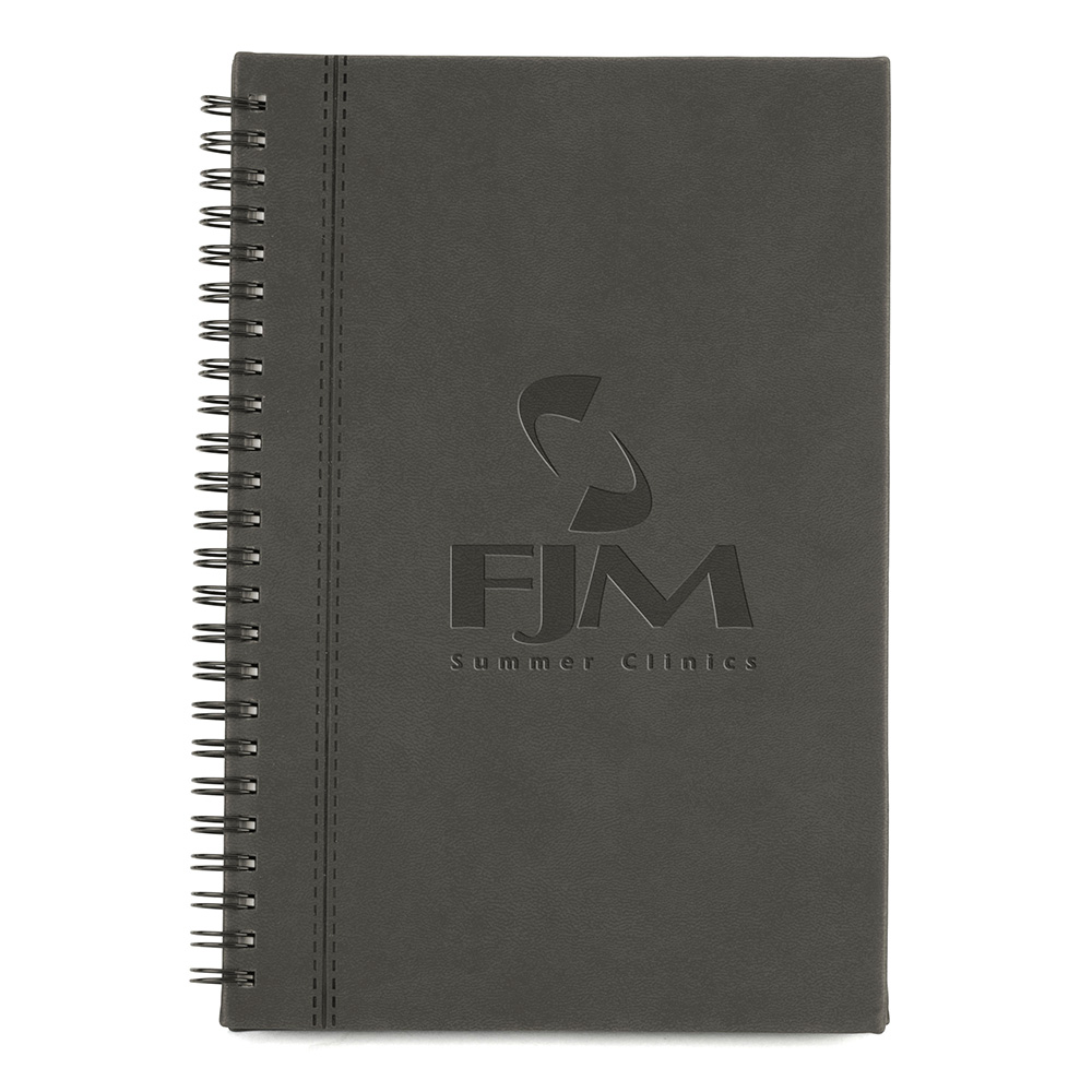 - Spiral bound 100 ivory sheet lined notebook; soft touch PU cover with front stitch detail.