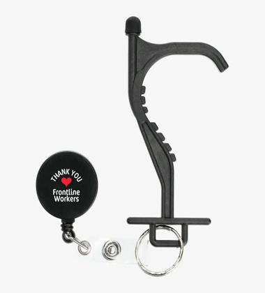 - The No Contact Keychain is a must-have work accessory. This keychain tool helps to avoid contact with dirty, contaminated surfaces. This multi-purpose tool can be used when opening doors, pressing buttons, using the ATM, and carrying shopping bags. Made from reinforced nylon. Hook shape designed to grab a handle and open doors. Rubber stylus can be used on signature pads, ATMs, and cell phones or tablets. Retractable badge holder clip that extends 3ft for ease of use. Add this to your assortment of PPE.