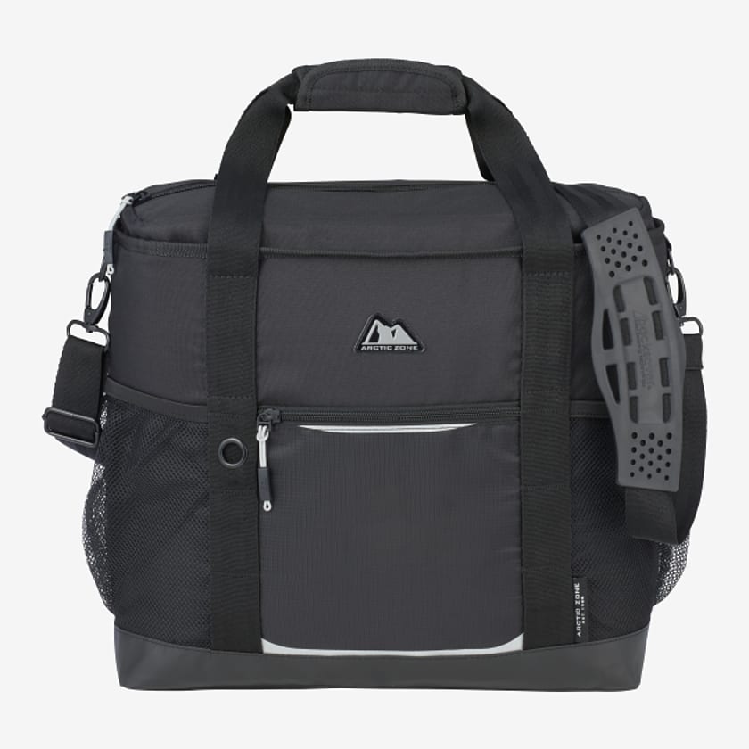 - The Arctic Zone 30 Can Ultimate Sport Cooler features a sturdy, PEVA lining that keeps contents cold and prevents leaking. The cooler is easily portable with an adjustable shoulder strap and grab handles. The Ultimate Sport Cooler can hold up to 30 cans with a zippered main compartment, two side mesh pockets and a front zippered pocket.