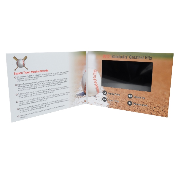 The digital card stores videos up to 2 GB. A 1,000mAh rechargeable battery plays for roughly 60 minutes before the device needs to be recharged but this varies depending on the video file. Made of heavy card stock, the card can be full-color printed for complete customization.