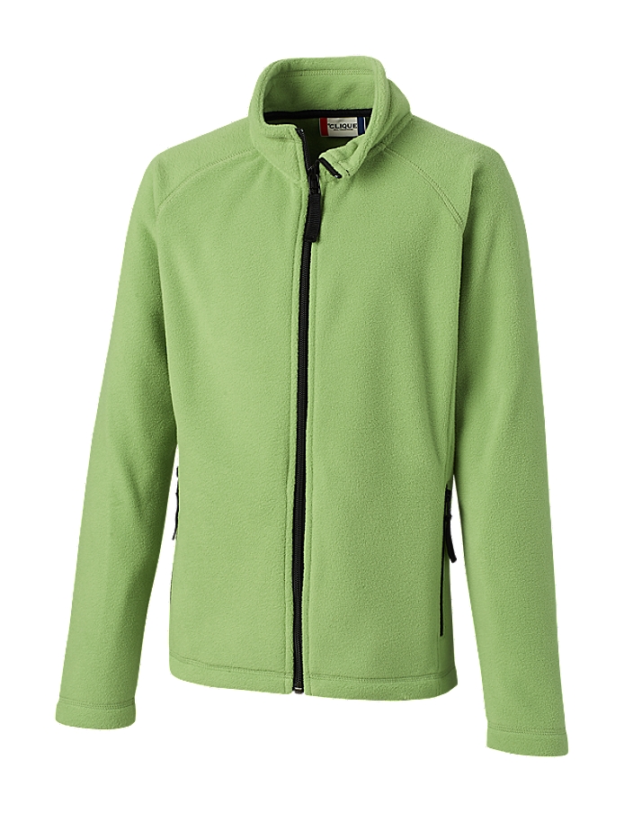 - 100% polyester microfleece, Full-zip with self-fabric mock neck, Two front zipper pockets, Raglan sleeves, Decorative overlock seams on shoulder, neck and hem, 5.9 ounces