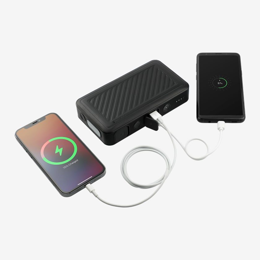 - The mophie® Powerstation Go Rugged Compact has 8100 mAh/29.9Wh rechargeable lithium battery and works as a regular power bank with dual USB-A outputs and floodlight. It includes jumper cables that can jump start a full-sized truck and 12V vehicle batteries in seconds. Also includes UL listed AC wall plug, carrying pouch and USB-A-to-Type-C cable. Packaged in a premium gift box. Power banks are permitted in carry-on luggage only, and at the discretion of TSA agents. Please charge power bank before initial use.