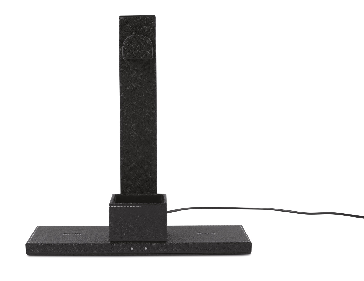 - Keep your everyday essentials and small accessories close by and organized, making your desk clutter-free. Never misplace your headphones again. Integrated headphone stand provides a safe and accessible place to store your headphones when not in use. Wirelessly charge your devices. Anti-slip base. LED indicator illuminates when device is being charged or a metal object has been detected. Max. Output: 10W x 2. Max. Case Thickness: 0.2 inches.
